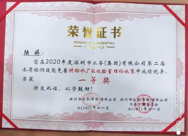 經(jīng)過5天的激烈角逐,憑借著扎實(shí)的理論基礎(chǔ)、嫻熟的現(xiàn)場(chǎng)操作和默契的團(tuán)隊(duì)合作,揚(yáng)州龍川水務(wù)公司陸婷榮獲供排水廠級(jí)化驗(yàn)室理論、綜合比賽“雙一等獎(jiǎng)”,陸婷、于淼榮獲供排水廠級(jí)化驗(yàn)室比賽團(tuán)體二等獎(jiǎng)。